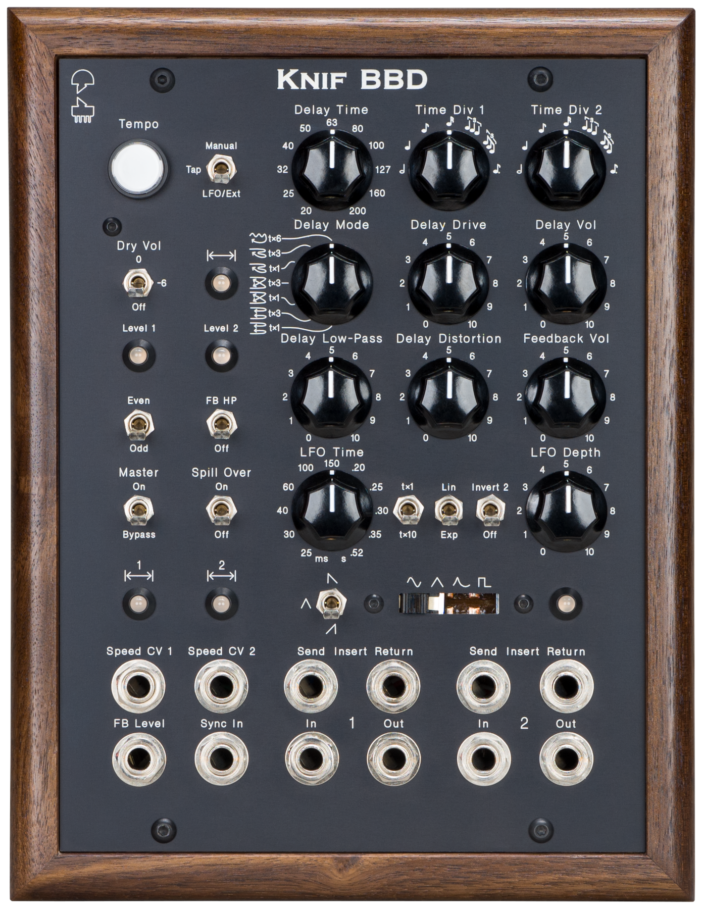 Knif BBD is a stereophonic analog bucket brigade device (BBD) delay. It is a no-compromise device rich in features. What sets it far apart from any other device in the market are the unique self-adapting anti-aliasing and reconstruction filters which provide the widest possible frequency response for any given delay time setting without any aliasing.